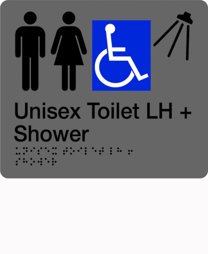 280x220mm - Braille - Silver PVC - Unisex Accessible Toilet and Shower (Left Hand)