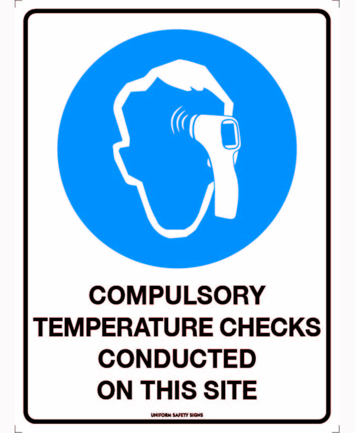 WORKWEAR, SAFETY & CORPORATE CLOTHING SPECIALISTS - 300x225mm - Poly - Compulsory Temperature Checks Conducted on This Site (Face & Thermometer picto)