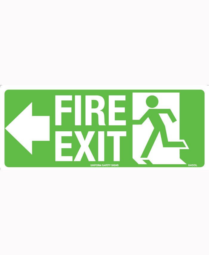 WORKWEAR, SAFETY & CORPORATE CLOTHING SPECIALISTS - 350x145mm - Metal - Luminous - Fire Exit (Running Man Picto) with Arrow Left