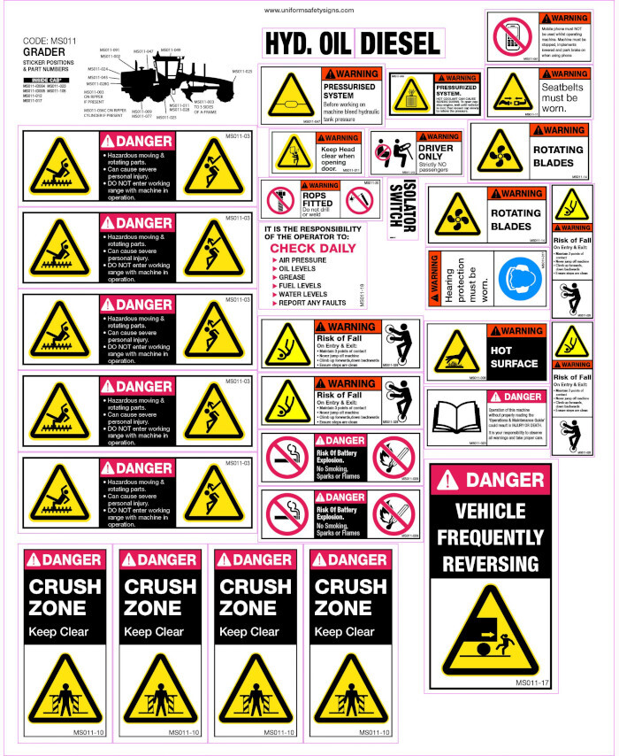 WORKWEAR, SAFETY & CORPORATE CLOTHING SPECIALISTS - 425x515mm - Machinery Sticker Sets - Grader (31 decals per sheet)