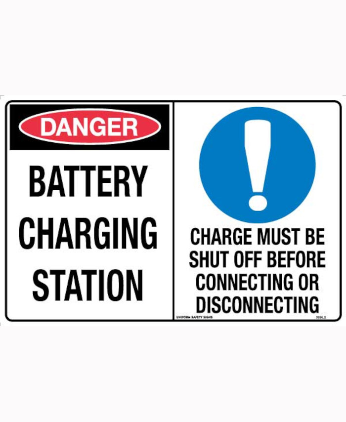 WORKWEAR, SAFETY & CORPORATE CLOTHING SPECIALISTS - 450x300mm - Poly - Danger Battery Charging Station / Charge Must Be Shut Off Before Connecting or Di