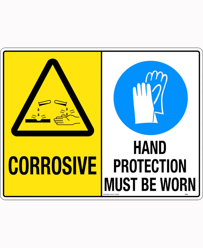 WORKWEAR, SAFETY & CORPORATE CLOTHING SPECIALISTS - 600x400mm - Metal - Multi Sign - Corrosive/Hand Protection Must Be Worn