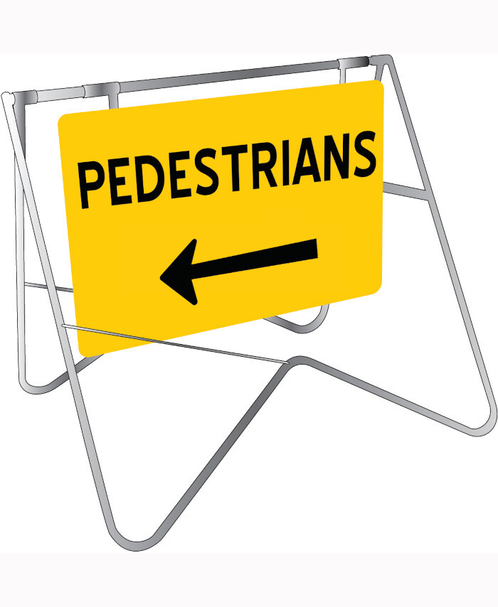 WORKWEAR, SAFETY & CORPORATE CLOTHING SPECIALISTS - 900x600mm - Swing Stand and Sign - Pedestrians (Left Arrow)