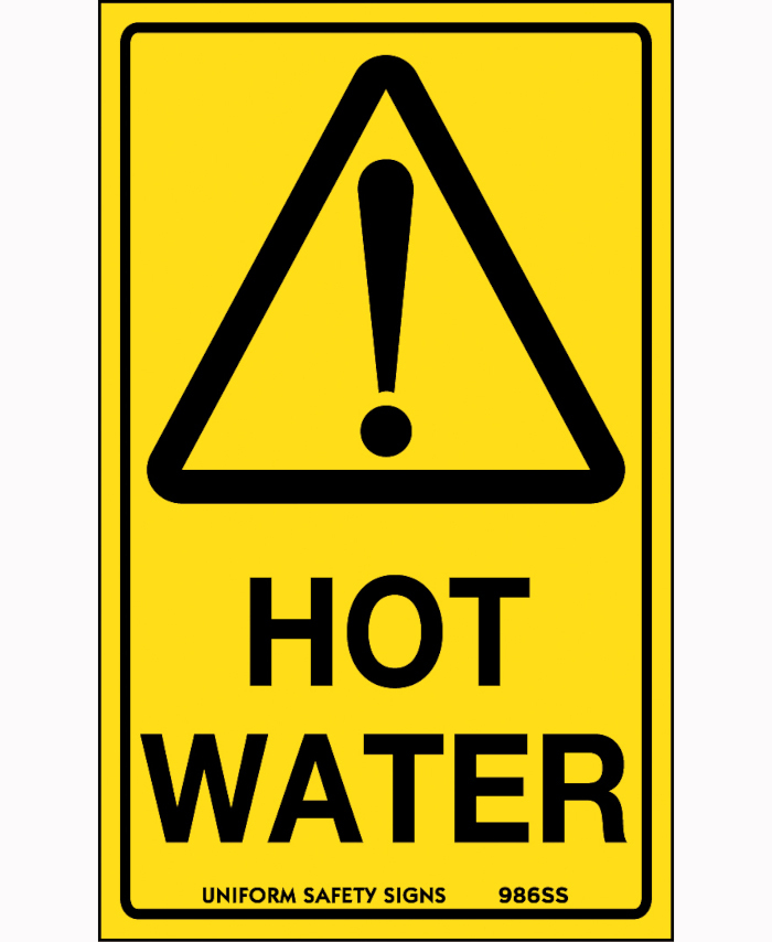 WORKWEAR, SAFETY & CORPORATE CLOTHING SPECIALISTS - 90x55mm - Self Adhesive - Sheet of 10 - Caution Hot Water