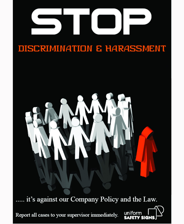 WORKWEAR, SAFETY & CORPORATE CLOTHING SPECIALISTS - A3 Laminated Safety Poster - Stop Discrimination and Harassment   . It's against the Law and our Com