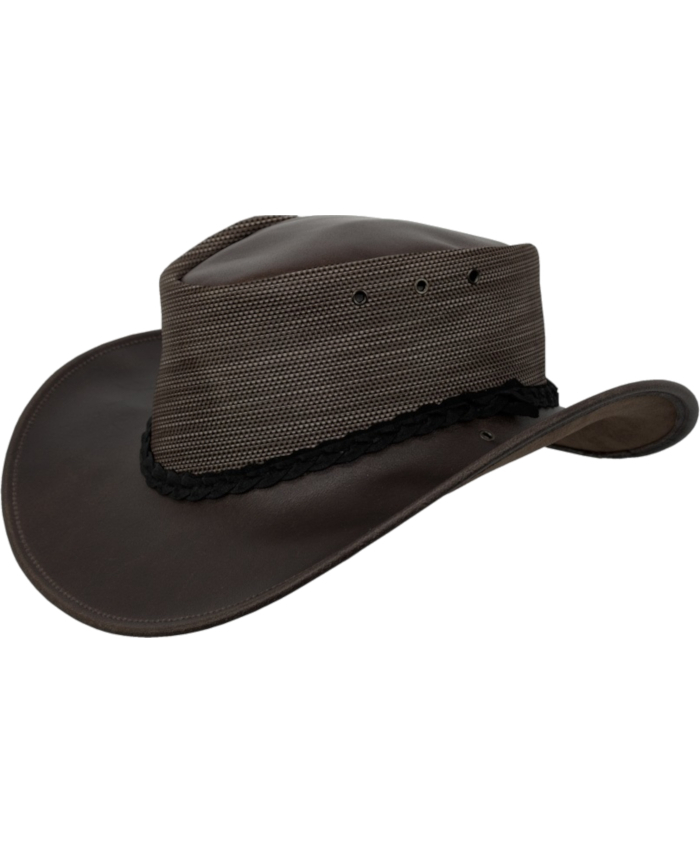 The Murray Hats signature brim profile is curved like the bends of its iconic river namesake, creating a classic Australian look Assembled from Italian leather cow hide with a waxed finish for the top and brim, and breathable open mesh for the gusset Optional sewn in full gusset lining available as a custom order Fitted with a black plaited synthetic felt band Soft, high quality leather shapes to the wearer s head over time ensuring a custom comfortable fit Australian made by Newcastle Hats in Western Australia Featuring a wide brim with a rolled edge supported by brimlock for a squashable yet durable style