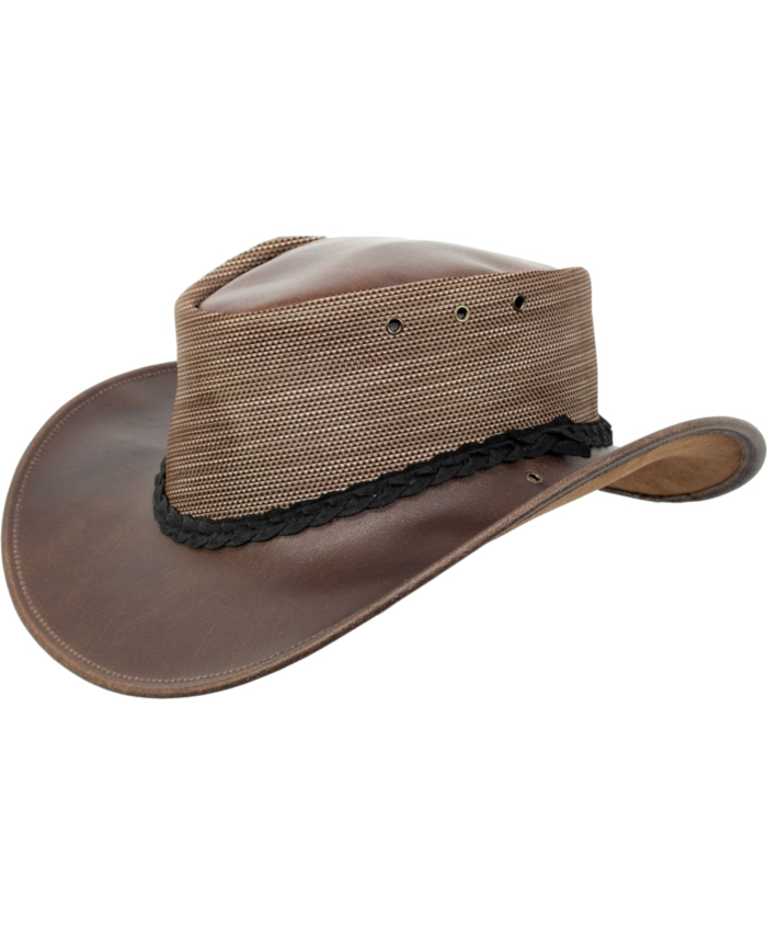 The Murray Hats signature brim profile is curved like the bends of its iconic river namesake, creating a classic Australian look Assembled from Italian leather cow hide with a waxed finish for the top and brim, and breathable open mesh for the gusset Optional sewn in full gusset lining available as a custom order Fitted with a black plaited synthetic felt band Soft, high quality leather shapes to the wearer s head over time ensuring a custom comfortable fit Australian made by Newcastle Hats in Western Australia Featuring a wide brim with a rolled edge supported by brimlock for a squashable yet durable style