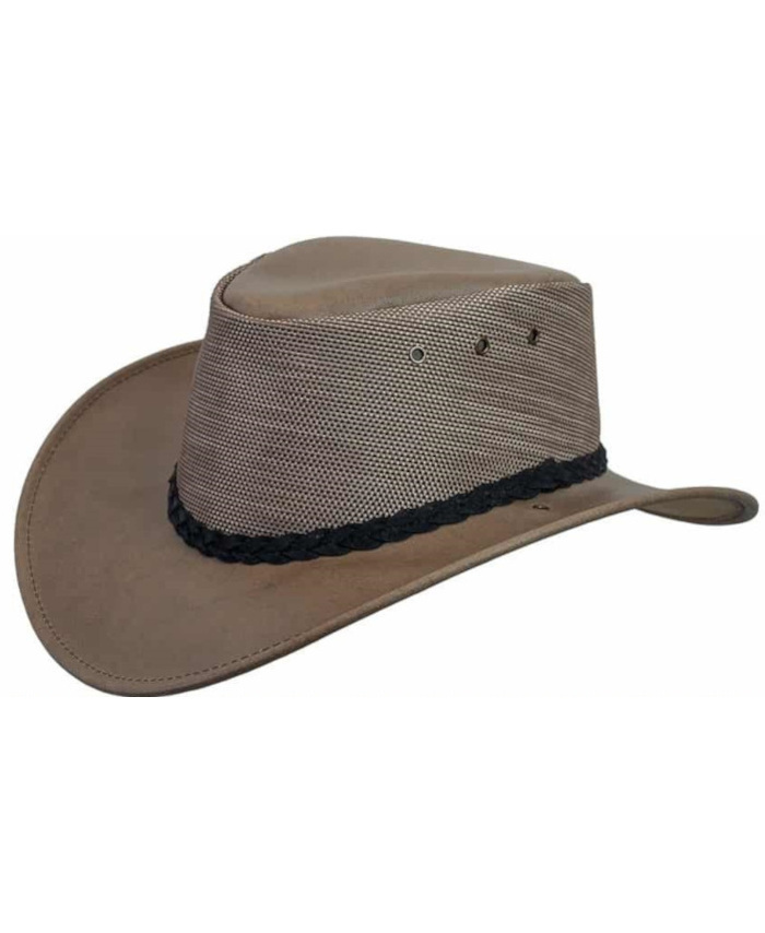 The Murray Hats signature brim profile is curved like the bends of its iconic river namesake, creating a classic Australian look Assembled from Italian leather cow hide with a waxed finish for the top and brim, and breathable open mesh for the gusset Optional sewn in full gusset lining available as a custom order Fitted with a black plaited synthetic felt band Soft, high quality leather shapes to the wearer s head over time ensuring a custom comfortable fit Australian made by Newcastle Hats in Western Australia Featuring a wide brim with a rolled edge supported by brimlock for a squashable yet durable style