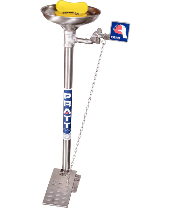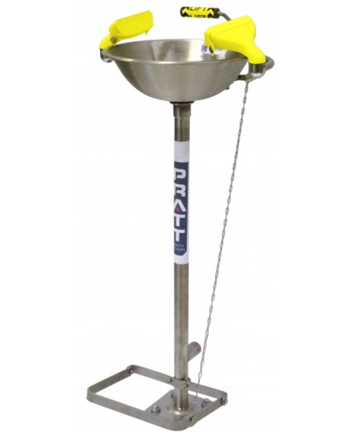 PRATT PEDESTAL MOUNTED TRIPLE NOZZLE EYE & FACE WASH WITH BOWL & FOOT TREADLE